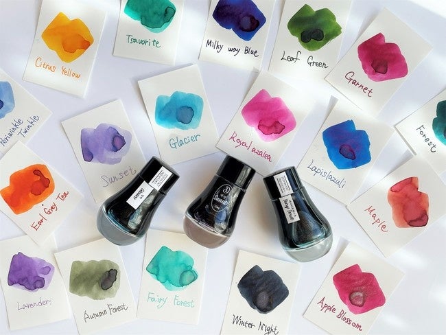 自然と季節をテーマに商品を企画しているインクブランド。季節の移り変わりをラメや濃淡のある色味で表現しました。今回はスタンダードシリーズ、パールシリーズの2つのラインを展開。スタンダードシリーズは濃淡のある17色、パールシリーズはラメ入りの14色できらめく色彩を楽しめます。