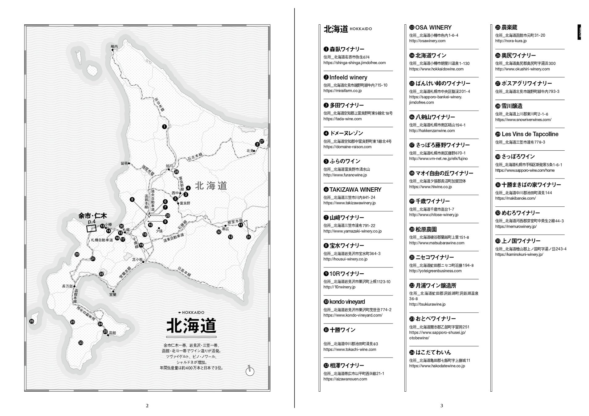 北海道から鹿児島まで日本全国にワイナリーがあり、いまやその数は400軒を超えました。この「日本ワイナリーアドレスブック2022」は、ワイナリーめぐりの際に所持しやすいハンディサイズの小冊子で、ワイナリーの住所とホームページ、もしくは公式SNSのアドレス、各ワイナリー所在地を示したマップを掲載しています。新酒もお目見えする秋の行楽シーズン、日本のワイナリーめぐりのお供に、また全国のワイナリーを俯瞰できるデータブックとして、ぜひご活用ください。