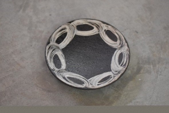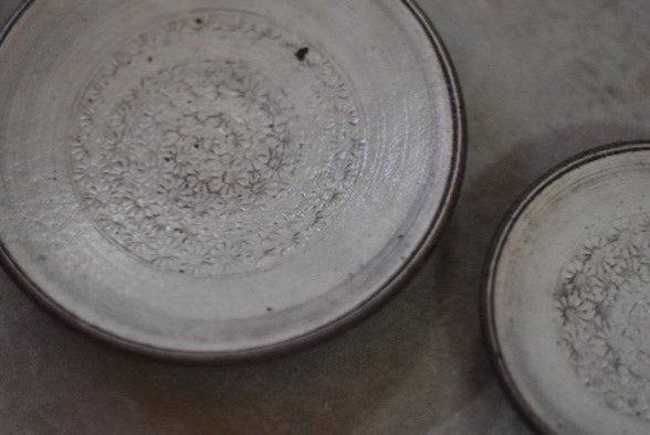 皿の中央にひとつずつ押された模様と、浮き出るわずかな濃淡の違いが魅力の粉引シリーズ。