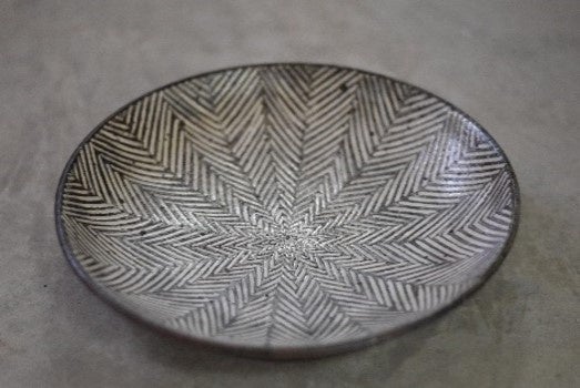 白い化粧土を埋め込んで作られる三島手。池田大介の代名詞とも言えるへリーンボーン柄はモダンで和洋どちらにもマッチする。少し大きめの7寸皿はワンプレートにも。
