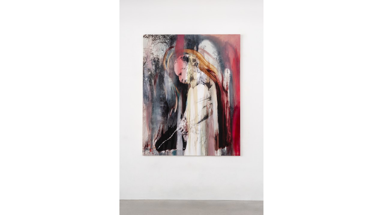 本展では、2023〜2025年に制作された作品を展示します。制作プロセスにおいては、旅先で撮影した写真に写り込んだ人物や風景を丁寧に描き起こし、それらをモノタイプ(※)で写し取り、その図像をキャンバス上で再構成しています。通常は一枚のみを刷るモノタイプにあえて刷りを重ねることで、図像は徐々に輪郭を失い、記憶の残像や作家自身の動機となる内的イメージと混ざり合いながら、元の風景とは異なる新たな情景が浮かび上がっていきます。こうして生まれた画面には、モノタイプ独特の刷りの風合いや支持体の素材感などを精緻にキャンバスに写し取る工程と、キャンバス上での作業によって生み出される筆致やテクスチャとが、多層的に蓄積され、イメージと物質性が巧妙に均衡を保ちながら共存しています。