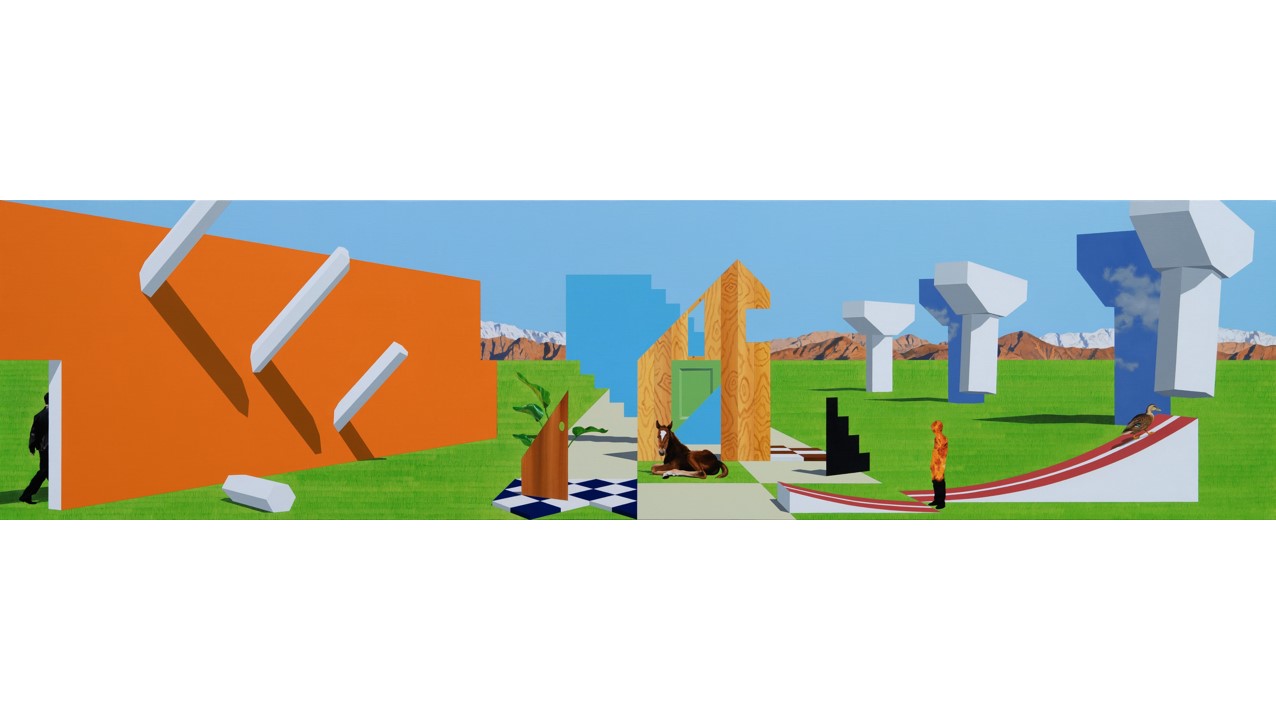私の絵画において立ち現れる時空間は、依然として「不特定」である。異なる時間や場所から選び取られたイメージ(構造物、オブジェ、人物)を、造形性のみに基づいて配置することで、画面の中にぎこちない調和を生み出している。関連性を持たない対象たちは、それぞれが存在しているだけで共存することはなく、ただ違和感を生じさせるにすぎない。私は決して物語を構築しようとはせず、制作を終えた後においても、自ら定義することのできない画面を志向している。ゆえに、一点透視の画面各所に配置された人物やオブジェはキャラクター性を失い、ジェスチャーだけを残したまま漂っている。