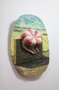 《はりつけられた気球の風景》H650×W430×D150mm/素材:紙、酢酸ビニル系樹脂、木/2025