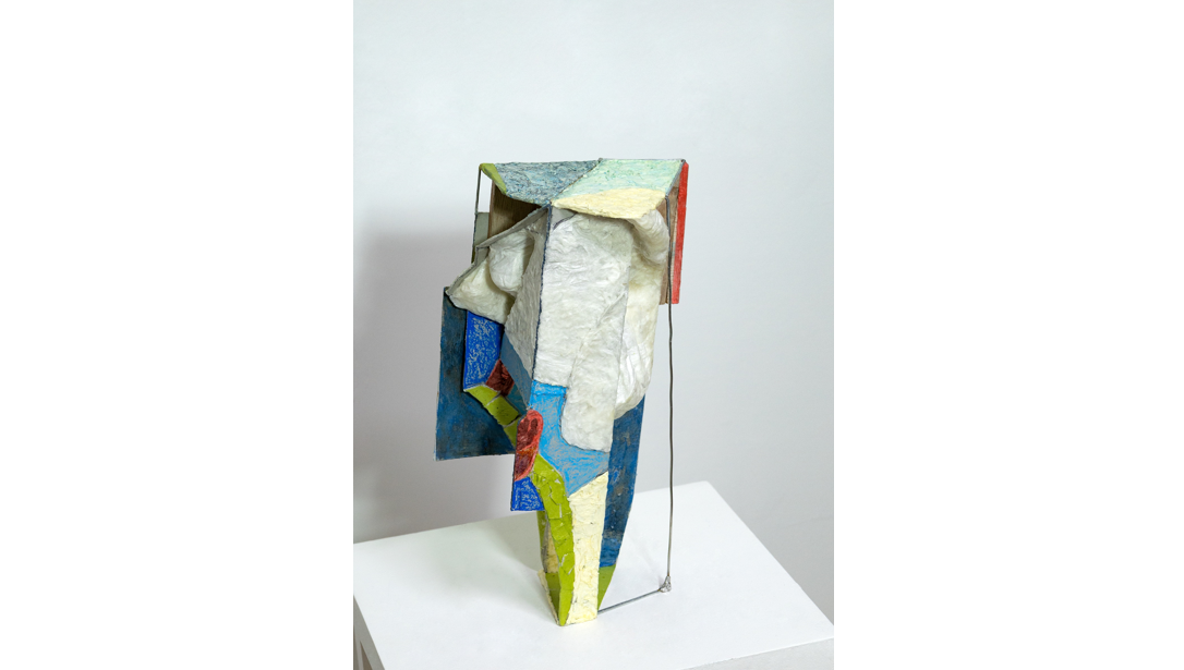 本岡景太は、日本の伝統的な張り子の技法を独自に発展させた「歪曲張り子」によって立体作品を制作するアーティストです。制作においては、自ら染色した紙をモチーフに合わせ選択し、それらを型に張り付けて造形することで、絵画的な秩序を設定しながら、同時に彫刻の形態を構成していきます。