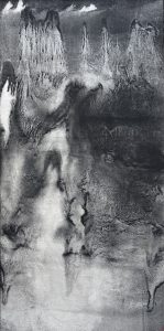 私が使用する《古墨》は、何十年・何百年もの歳月が経っている。長い時間を固形の《墨》という形の中に押し込められていた《煤》に、清らかな水を与え、硯でほぐすことで、長い眠りから目覚めさせ、現代に解き放つ。その粒子を、水と共に筆で吸い上げ、紙の上に走らせる。水の中に分散している墨の粒子は、画中で踊り、揺らぎ、ゆっくりと沈む。やがて水が引き、粒子が紙の上に『現象』を浮かび上がらせるのだ。そこには、墨が経た時間をも内包している。